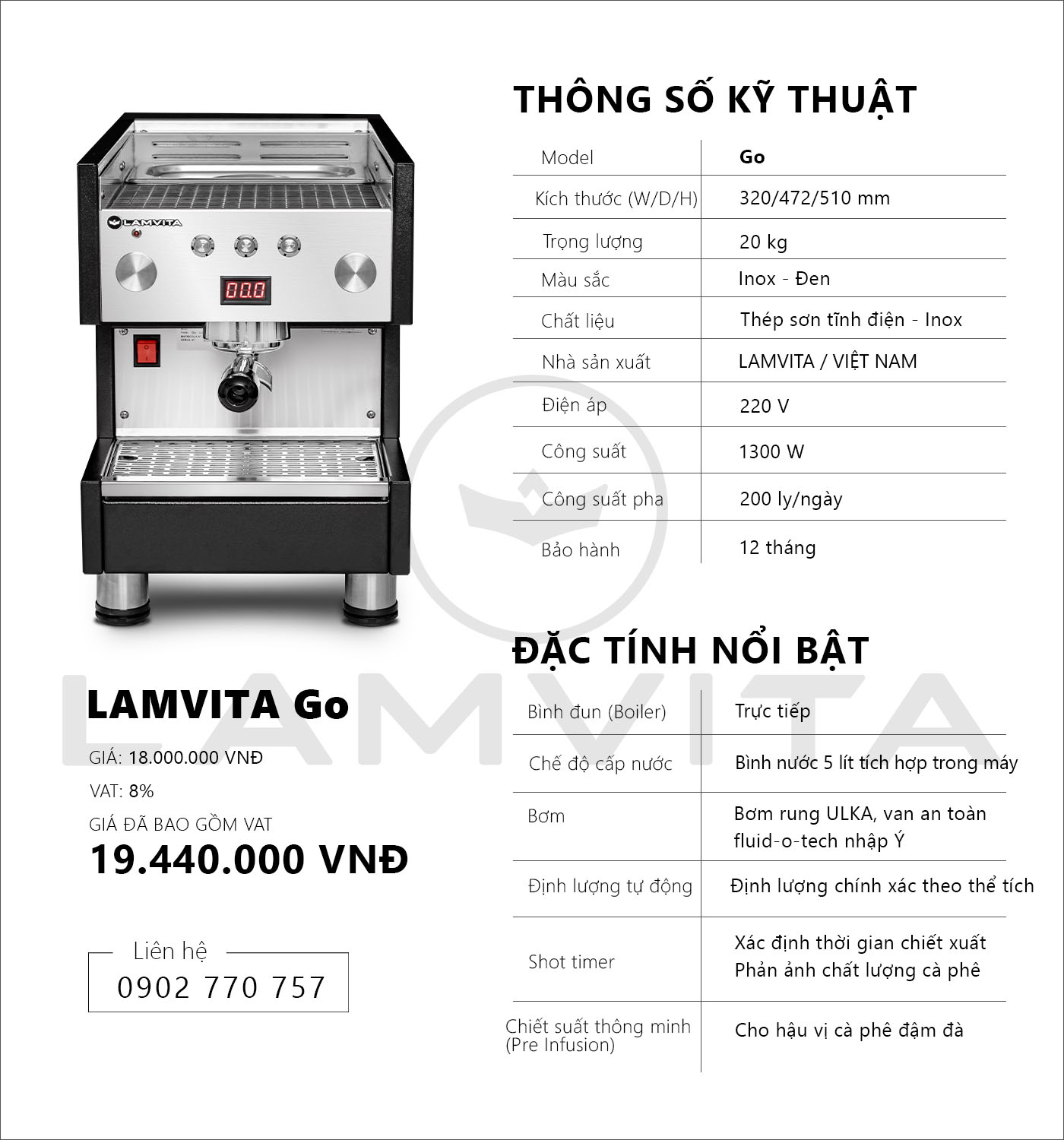 LAMVITA Go được trang bị đầy đủ các tính năng tiện lợi cho mô hình cà phê năng động. Máy có tích hợp bình nước inox cao cấp 5 lít trong máy, có chế độ nhắc người dùng châm khi thiếu nước. Thiết kế gọn gàng, dễ di chuyển, không chiếm nhiều diện tích quầy bar.